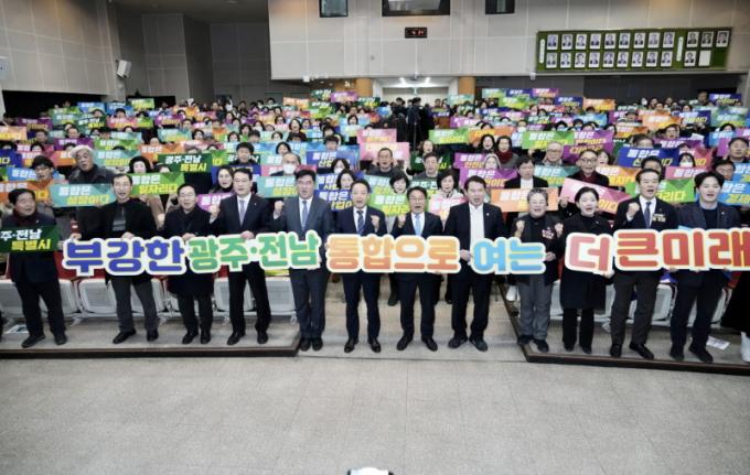 [È£³²´º½º¶óÀÎ = ¼ÀºÈ« ±âÀÚ] ±¤ÁÖÀü³² ÇàÁ¤ÅëÇÕÀ» ÁÖµµÇÒ ¹Î°£Çù·Â±â±¸°¡ ´éÀ» ¿Ã·È´Ù. ±¤ÁÖ¡¤Àü³²Áö¿ª °¢°è ´ëÇ¥ 500¸íÀÌ 320¸¸ ½Ãµµ¹ÎÀÇ ¶æ°ú ¿ª·®À» Çϳª·Î °áÁýÇØ ¿ì¸®³ª¶ó ÃÖÃÊ ÅëÇÕ ±¤¿ªÁö¹æÁ¤ºÎ ź»ý¿¡ ¾ÕÀå¼°Ú´Ù°í °áÀǸ¦ ´ÙÁ³´Ù. ±¤ÁÖ±¤¿ª½Ã(½ÃÀå °±âÁ¤)¿Í Àü¶ó³²µµ(Áö»ç ±è¿µ·Ï)´Â 16ÀÏ ¿ÀÈÄ 3½Ã ±è´ëÁßÄÁº¥¼Ç¼¾ÅÍ¿¡¼ ¡®±¤ÁÖ‧Àü³² ÇàÁ¤ÅëÇÕ ÃßÁø ¹ü½Ãµµ¹Î ÇùÀÇȸ¡¯ ¹ß´ë½ÄÀ» ¿°í, ´ëÇѹα¹ ÃÖÃÊÀÇ ÅëÇÕ ±¤¿ªÁö¹æÁ¤ºÎ ź»ýÀ» À§ÇÑ ½Ãµµ¹Î ¿ª·® °áÁý¿¡ ³ª¼¹´Ù. ÇùÀÇȸ ¹ß´ë½Ä¿¡´Â °±âÁ¤ ±¤ÁÖ½ÃÀå°ú ±è¿µ·Ï Àü³²¡¦
