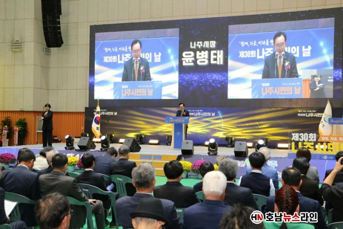 À±º´Å ³ªÁÖ½ÃÀåÀº ¡°½Ã¹ÎÀÇ ³¯Àº ¿ì¸® ¸ðµÎ°¡ ³ªÁÖÀÇ ÁÖÀÎÀÓÀ» È®ÀÎÇÏ´Â ¼ÒÁßÇÑ ³¯¡±À̶ó¸ç ¡°¿À´ÃÀÇ ¼º°ú¿¡ ¸Ó¹°Áö ¾Ê°í ½Ã¹Î°ú ÇÔ²² ´õ Å« ³ªÁÖ, ¿µ»ê° ¸£³×»ó½º¸¦ ÇâÇØ ³ª¾Æ°¡°Ú´Ù¡±°í ¸»Çß´Ù.