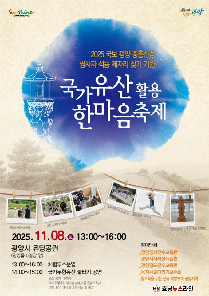 ±è¸í´ö ¹®È¿¹¼ú°úÀåÀº ¡°À̹ø ±¹°¡À¯»ê Ȱ¿ë ÇѸ¶À½ ÃàÁ¦´Â ½Ã¹Î°ú ÇÔ²² ±¤¾çÀÇ ±¹°¡À¯»êÀÌ Áö´Ñ °¡Ä¡¸¦ µÇ»õ±â°í, ½Ö»çÀÚ ¼®µî Á¦ÀÚ¸® ã±âÀÇ Àǹ̸¦ °øÀ¯ÇÏ´Â ¶æ±íÀº ÀÚ¸®¡±¶ó¸ç ¡°¾ÕÀ¸·Îµµ Áö¿ªÀÇ ¹®ÈÀ¯»êÀ» Ȱ¿ëÇÑ ´Ù¾çÇÑ ÇÁ·Î±×·¥À» ÅëÇØ ±¤¾çÀÇ ¿ª»ç¿Í ¹®È¸¦ ³Î¸® ¾Ë¸®°Ú´Ù¡±°í ¸»Çß´Ù.