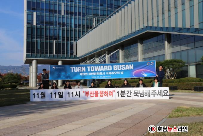 [È£³²´º½º¶óÀÎ = ¼ÀºÈ« ±âÀÚ] ±¤ÁÖÁö¹æº¸ÈÆÃ»(ûÀå ±è¼®±â)¿¡¼´Â 5ÀÏ ¡®À¯¿£ÂüÀü¿ë»ç ±¹Á¦Ã߸ðÀÇ ³¯(11.11)¡¯À» ¾ÕµÎ°í ¼¼°è À¯ÀÏÀÇ À¯¿£±â³ä°ø¿øÀÌ ÀÖ´Â ºÎ»êÀ» ÇâÇÏ¿© Àü ±¹¹ÎÀÌ 1ºÐ°£ Ã߸𠹬³äÇÏ´Â ¡®ÅÏ Åõ¿öµå ºÎ»ê(Turn Toward Busan)¡¯ È«º¸ Ä·ÆäÀÎÀ» Á÷¿øµéÀÌ ÇÔ²² Á¤ºÎ±¤ÁÖÇÕµ¿Ã»»ç ±¤Àå¿¡¼ ½Ç½ÃÇÏ¿´´Ù.