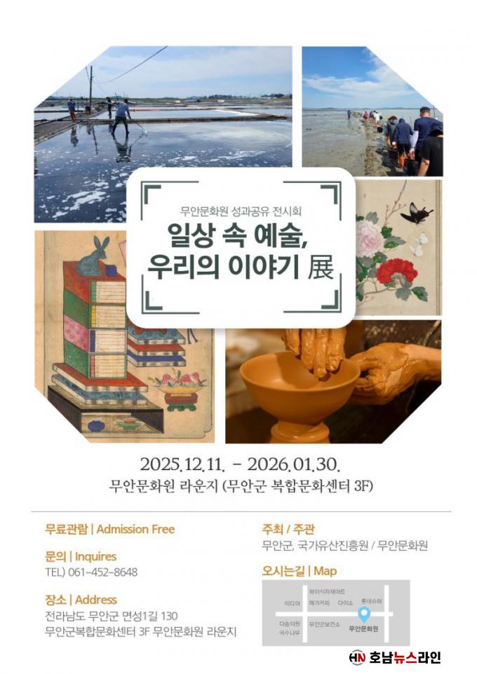 [È£³²´º½º¶óÀÎ = ¼­ÀºÈ« ±âÀÚ] ¹«¾È¹®È­¿øÀº ¿À´Â 12¿ù 11ÀÏ(¸ñ)ºÎÅÍ 2026³â 1¿ù 30ÀÏ(±Ý)±îÁö ¹«¾È±º º¹ÇÕ¹®È­¼¾ÅÍ 3Ãþ ¹«¾È¹®È­¿ø ¶ó¿îÁö º¹µµ¿¡¼­ 2025³â ¼º°ú°øÀ¯ Àü½Ãȸ ¡®ÀÏ»ó ¼Ó ¿¹¼ú, ¿ì¸®ÀÇ À̾߱â î÷¡¯À» °³ÃÖÇÑ´Ù°í ¹àÇû´Ù.