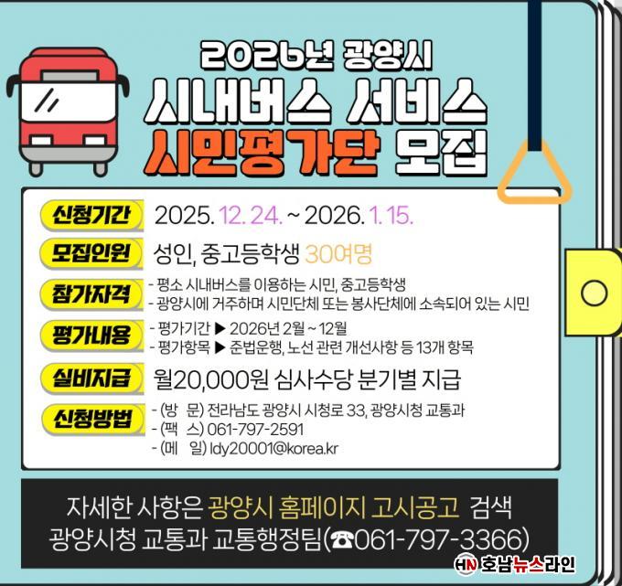 ½Ã¹ÎÆò°¡´ÜÀº ¼ºÀΰú Áß¡¤°íµîÇлý 30¸í ³»¿Ü·Î ±¸¼ºµÇ¸ç, 2026³â 2¿ùºÎÅÍ 12¿ù±îÁö °ü³» ¿î¼ö¾÷üÀÎ ±¤¾ç±³ÅëÀÌ ¿î¿µÇÏ´Â 30°³ ³ë¼±À» ´ë»óÀ¸·Î Á÷Á¢ ½Ã³»¹ö½º¸¦ ÀÌ¿ëÇÏ¸ç Æò°¡ Ȱµ¿À» ¼öÇàÇÏ°Ô µÈ´Ù. ÁÖ¿ä Æò°¡ ³»¿ëÀº Áعý ¿îÇà ¿©ºÎ, Ä£Àýµµ, ¾ÈÀü¼º, ³ë¼± ¿î¿µÀÇ ÀûÁ¤¼º µî ½Ã³»¹ö½º ¼ºñ½º Àü¹ÝÀÌ´Ù.