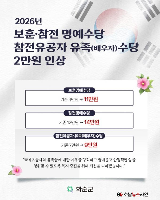 [È£³²´º½º¶óÀÎ = ¼­ÀºÈ« ±âÀÚ] È­¼ø±º(±º¼ö ±¸º¹±Ô)Àº 2026³â 1¿ùºÎÅÍ ±¹°¡º¸ÈÆ´ë»óÀÚ¿Í À¯Á·¿¡ ´ëÇÑ ¿¹¿ì¸¦ ÇÑÃþ °­È­Çϱâ À§ÇØ º¸ÈÆ °ü·Ã ¼ö´çÀ» ¿ù 2¸¸ ¿ø¾¿ ÀλóÇÑ´Ù°í ¹àÇû´Ù.