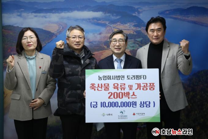 ³ªÁÖ½Ã(½ÃÀå À±º´ÅÂ)´Â Áö³´Þ 30ÀÏ ³ó¾÷ȸ»ç¹ýÀÎ Å丮ÆÊFD(´ëÇ¥ ÃÖ¿øÁØ)°¡ °ü³» Ãë¾à°èÃþ Áö¿øÀ» À§ÇØ »ï°ã»ì, ¸ñ»ì, ¾Õ´Ù¸´»ì µî Ãà»ê¹° °¡°øÇ° 200¹Ú½º(1õ¸¸ ¿ø »ó´ç)¸¦ ±âŹÇß´Ù°í 2ÀÏ ¹àÇû´Ù.