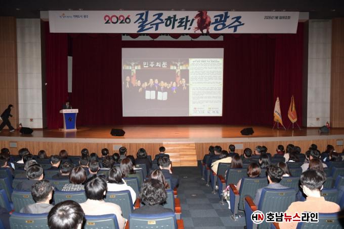 ° ½ÃÀåÀº ƯÈ÷ ±¤ÁÖ¸¦ ¡®ÆÛ½ºÆ® Æë±Ï¡¯¿¡ ºñÀ¯ÇÏ¸ç ¡°±¤ÁÖ´Â ¹ÎÁÖÁÖÀÇ, ÀΰøÁö´É(AI), º¹Áö, À§±â ´ëÀÀ¿¡¼ °¡Àå ¸ÕÀú ºÒÈ®½Ç¼º¿¡ ¶Ù¾îµç µµ½Ã¿´´Ù¡±¸ç ¡°ÇàÁ¤ÅëÇÕ ¿ª½Ã Áö¿ª ÁÖµµ ¼ºÀå ±¹°¡±ÕÇü¹ßÀüÀÇ Ã¹ »ç·Ê¸¦ ¸¸µé¾î³»¾ß ÇÑ´Ù¡±°í ¸»Çß´Ù.