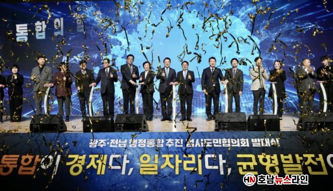 ±¤ÁÖ±¤¿ª½Ã(½ÃÀå °±âÁ¤)¿Í Àü¶ó³²µµ(Áö»ç ±è¿µ·Ï)´Â 16ÀÏ ¿ÀÈÄ 3½Ã ±è´ëÁßÄÁº¥¼Ç¼¾ÅÍ¿¡¼ ¡®±¤ÁÖ‧Àü³² ÇàÁ¤ÅëÇÕ ÃßÁø ¹ü½Ãµµ¹Î ÇùÀÇȸ¡¯ ¹ß´ë½ÄÀ» ¿°í, ´ëÇѹα¹ ÃÖÃÊÀÇ ÅëÇÕ ±¤¿ªÁö¹æÁ¤ºÎ ź»ýÀ» À§ÇÑ ½Ãµµ¹Î ¿ª·® °áÁý¿¡ ³ª¼¹´Ù.