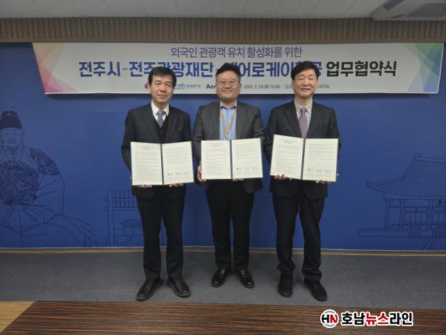 ÀüÁÖ½Ã¿Í ÀüÁÖ°ü±¤Àç´Ü, ¿¡¾î·ÎÄÉÀÌÇ×°ø´Â 19ÀÏ ½Ãû 3Ãþ ¼ÒȸÀǽǿ¡¼ À±µ¿¿í ÀüÁֺνÃÀå°ú ¿ë¼±Áß ÀüÁÖ°ü±¤Àç´Ü ´ëÇ¥ÀÌ»ç, äÁ¤ÈÆ ¿¡¾î·ÎÄÉÀÌÇ×°ø ¿µ¾÷¿î¼Ûº»ºÎÀå µîÀÌ Âü¼®ÇÑ °¡¿îµ¥ ¡®¿Ü·¡ °ü±¤°´ À¯Ä¡ ¹× °øµ¿ ¸¶ÄÉÆÃÀ» À§ÇÑ ¾÷¹«Çù¾à¡¯À» ü°áÇß´Ù.
