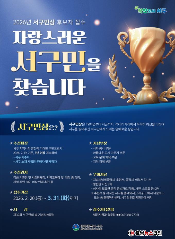 Èĺ¸ÀÚ Ãßõ ±âÇÑÀº 3¿ù31ÀϱîÁöÀ̸ç Ãßõ¼, °øÀûÁ¶¼ µî °ü·Ã ¼·ù¸¦ ÁغñÇØ ¼±¸Ã» ÇàÁ¤Áö¿ø°ú(062-360-7792)·Î Á¦ÃâÇÏ¸é µÈ´Ù. ½Ã»ó½ÄÀº ¡®Á¦32ȸ ¼±¸¹ÎÀÇ ³¯¡¯ ±â³äÇà»ç¿¡¼ ÁøÇàµÉ ¿¹Á¤ÀÌ´Ù.