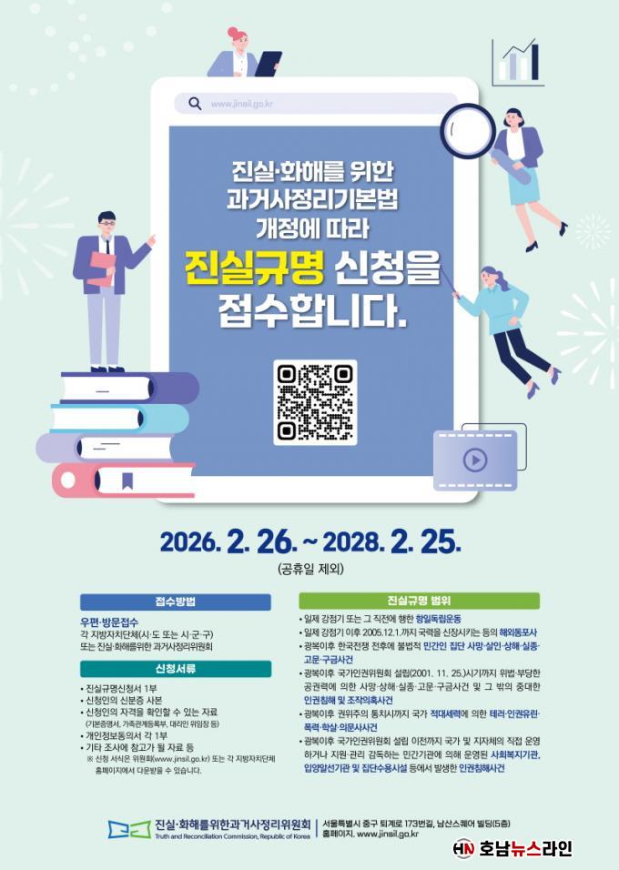 ½ÅûÀº Çѱ¹ÀüÀï ÀüÈÄ ¹Î°£ÀÎ Áý´ÜÈñ»ý »ç°Ç µî ±¹°¡ Æø·Â°ú ÀαÇÄ§ÇØ »ç°ÇÀÇ Áø»óÀ» ¹àÈ÷°í, ÇÇÇØÀÚ ¸í¿¹¸¦ ȸº¹Çϱâ À§ÇÑ ÀýÂ÷·Î, 2028³â 2¿ù 25ÀϱîÁö 2³â°£ ÇÒ ¼ö ÀÖ´Ù. Èñ»ýÀÚ¡¤ÇÇÇØÀÚ ¹× ±× À¯Á·À̳ª Ä£Á·, »ç°ÇÀ» Á÷Á¢ °æÇ衤¸ñ°ÝÇ߰ųª ÀüÇØ µéÀº »ç¶÷µµ ½ÅûÇÒ ¼ö ÀÖÀ¸¸ç, ÁøÈÀ§¿Í Àü³²µµ, ½Ã±ºÀ» ¹æ¹®Çϰųª ¿ìÆíÀ» ÅëÇØ Á¢¼öÇÏ¸é µÈ´Ù.