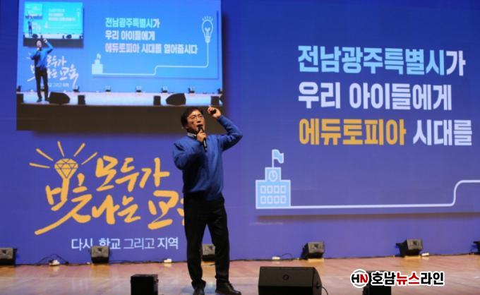 ¾Æ¿ï·¯ Àü³²°ú ±¤ÁÖ°¡ ÇϳªÀÇ ±³À°°øµ¿Ã¼·Î ³ª¾Æ°¡¾ß ÇÑ´Ù´Â Á¡µµ °Á¶µÆ´Ù. ±×´Â ¡°ÇàÁ¤ ÅëÇÕÀ» ³Ñ¾î ±³À°ÀÌ Áß½ÉÀÌ µÇ´Â ÅëÇÕÀÌ ÇÊ¿äÇÏ´Ù¡±¸ç ¡°¾ÆÀ̵éÀÌ Áö¿ªÀÇ °æ°è¸¦ ³Ñ¾î ´õ ³ÐÀº ±âȸ¸¦ ´©¸± ¼ö Àü³²±¤ÁÖÆ¯º°½Ã ¿¡µàÅäÇÇ¾Æ ½Ã´ë¡±¸¦ ¿¾î¾ß ÇÑ´Ù°í ¿ª¼³Çß´Ù.