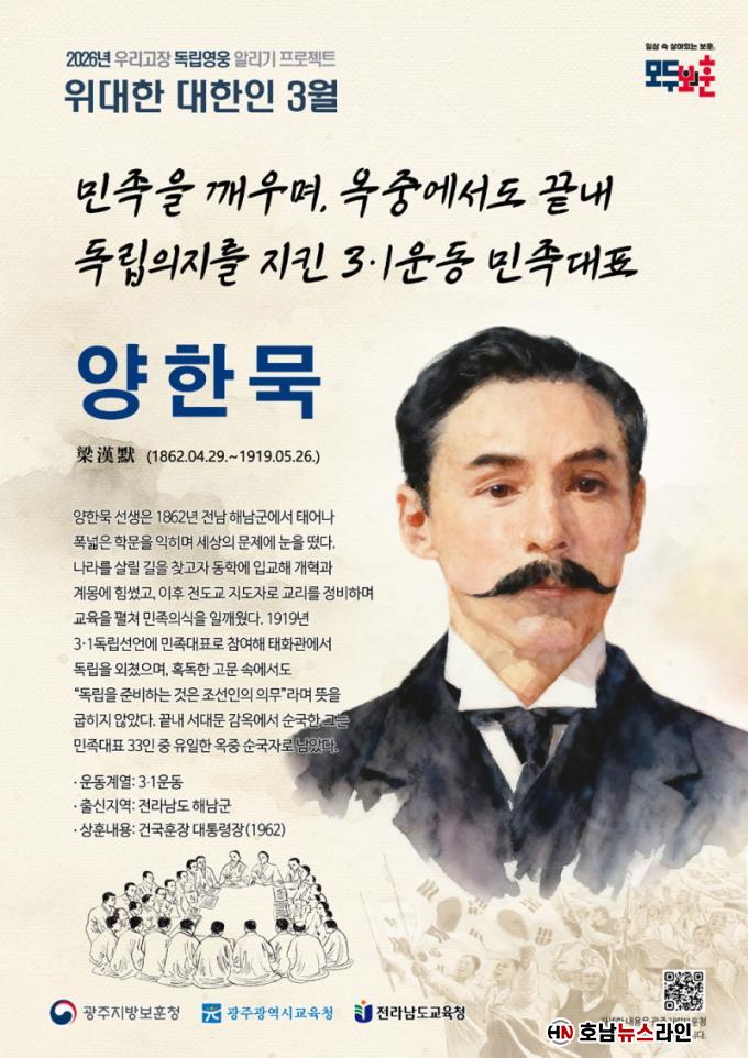 ±¤ÁÖÁö¹æº¸ÈÆÃ»Àº ¡°Á¦107ÁÖ³â 3¡¤1ÀýÀ» ¸ÂÀÌÇÏ¿© ¾çÇѹ¬ ¼±»ýÀÇ »î°ú µ¶¸³Á¤½ÅÀ» ³Î¸® ¾Ë¸®°í Áö¿ª¹ÎµéÀÌ ¿ì¸® °íÀåÀÇ ÀÚ¶û½º·¯¿î ¿ª»ç¸¦ µÇ»õ±â´Â °è±â°¡ µÇ±â¸¦ ¹Ù¶õ´Ù¡±°í ¹àÇû´Ù.