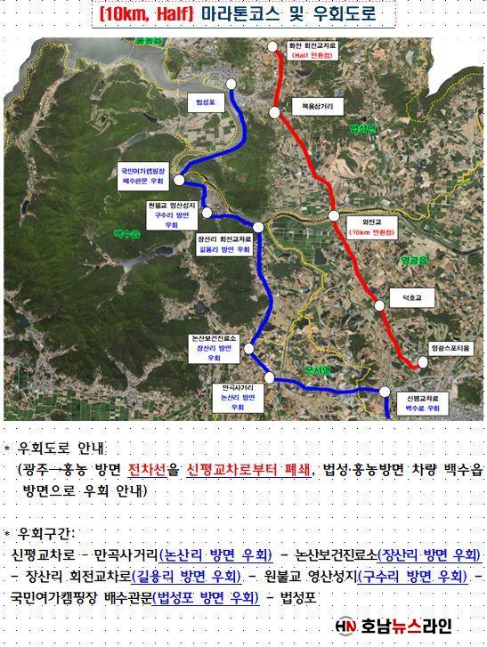 ¾ÈÀüÇÑ ´ëȸ ÁøÇàÀ» À§ÇØ Çà»ç ´çÀÏ 3¿ù 22ÀÏ 10km, Half ÄÚ½º´Â ¿ÀÀü 7½ÃºÎÅÍ ¿ÀÈÄ 12½Ã±îÁö ±¤ÁÖ¿¡¼ ¹ý¼º¡¤È«³ó¹æ¸é »óÇ༱ 2Â÷¼±À» ¿µ±¤À¾ Á¾»ê±³Â÷·ÎºÎÅÍ Â÷¼±À» Á¡Â÷ Ãà¼ÒÇÏ¿© ½ÅÆò±³Â÷·Î¿¡¼´Â Àü¸é ÅëÁ¦µÇ¸ç, 5km ÄÚ½º´Â ¿ÀÀü 7½Ã 30ºÐºÎÅÍ 10½Ã 30ºÐ±îÁö ½ºÆ÷Ƽ¿ò ÈÀü±³Â÷·Î¿¡¼ ¾Æ¸¶ºô·¹ ¾Õ ȸÀü±³Â÷·Î¸¦ Áö³ª ´ÜÁÖ¸® ȸÀü±³Â÷·Î¿¡¼ Å͹̳Π»ç°Å¸®, ´ëÀϳó¾à»ç ¾Õ±îÁö ÀüÂ÷¼±ÀÌ Àü¸é ÅëÁ¦µÇ¸ç, ½ºÆ÷Ƽ¿ò ȸÀü±³Â÷·Î¿¡¼ ´ÜÁÖ¸® ȸÀü±³Â÷·Î ±¸°£Àº ¾ç¹æÇâ Àü¸é ÅëÁ¦µÈ´Ù. ´Ü, ¾Æ¸¶ºô·¹¿Í RPC ¹æ¸éÀ¸·Î ÁøÀÔÇÏ·Á´Â Â÷·®Àº ´ÜÁÖ¸® ȸÀü±³Â÷·Î¿¡¼ ÀϽà Á¤Â÷ ÈÄ Åë°úÇÒ °èȹÀÌ´Ù.
