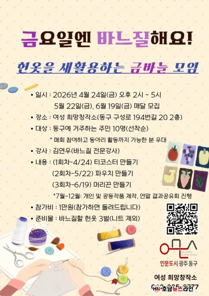 7¿ùºÎÅÍ 12¿ù±îÁö´Â ¸Åȸ ±Ý¿äÀÏ ¿ÀÈÄ 2½ÃºÎÅÍ 5½Ã±îÁö ¿©¼º Èñ¸ÁâÀÛ¼Ò(µ¿±¸ ±¸¼º·Î 194¹ø±æ 20, 2Ãþ)¿¡¼ °³ÀÎ ¹× °øµ¿À¸·Î ¹Ù´ÀÁú ÀÛǰÀ» Á¦ÀÛÇÒ ¿¹Á¤ÀÌ´Ù.