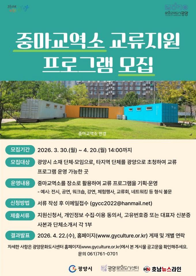 ÇÁ·Î±×·¥ ¿î¿µ ±â°£Àº 2026³â 5¿ùºÎÅÍ 11¿ù±îÁöÀ̸ç, ¼±Á¤ ´Üü´Â ±â°£ Áß 1ȸ Á߸¶±³¿ª¼Ò °ø°£À» Ȱ¿ëÇØ ±³·ù ÇÁ·Î±×·¥À» ÁøÇàÇÏ°Ô µÈ´Ù. ±¤¾ç¹®Èµµ½Ã¼¾ÅÍ´Â À̹ø »ç¾÷ÀÌ Áö¿ª °£ ¹®È±³·ù¸¦ ³ÐÈ÷°í ½Ã¹Î Âü¿©Çü ¹®È Ȱµ¿À» È®»êÇÏ´Â °è±â°¡ µÉ °ÍÀ¸·Î ±â´ëÇϰí ÀÖ´Ù.