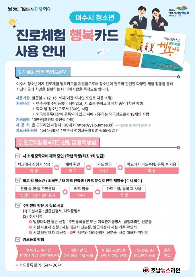 À̹ø »ç¾÷Àº ¿©¼ö½Ã¿¡ °ÅÁÖÇÏ´Â ÁßÇб³ 1Çгâ ÀçÇлý°ú 13¼¼ Çб³ ¹Û û¼Ò³âÀ» ´ë»óÀ¸·Î, 1ÀÎ´ç ¿¬°£ 10¸¸ ¿øÀ» ÃæÀü½Ä Æ÷ÀÎÆ® Ä«µå ÇüÅ·ΠÁö¿øÇÑ´Ù.