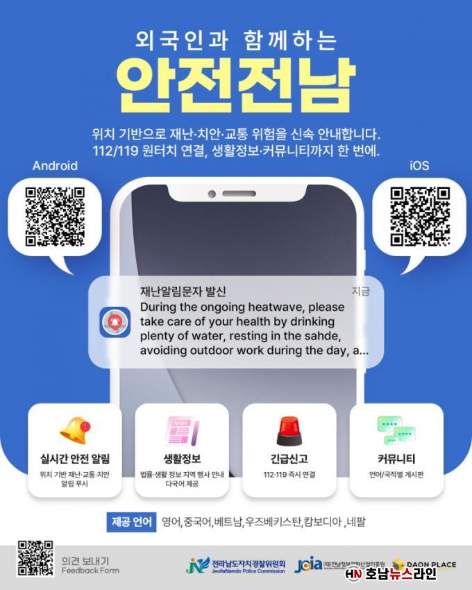 ¡®´Ù±¹¾î ¾ÈÀüÀü³² ¾Û¡¯Àº Àü³²ÀÚÄ¡°æÂûÀ§¿øÈ¸°¡ ¿î¿µÇÏ´Â ¼ºñ½º·Î, À糡¤Ä¡¾È¡¤±³Åë µî ´Ù¾çÇÑ ¾ÈÀü Á¤º¸¸¦ ´Ù±¹¾î·Î Á¦°øÇØ ´©±¸³ª ½±°í ½Å¼ÓÇÏ°Ô Á¤º¸¸¦ È®ÀÎÇÒ ¼ö ÀÖµµ·Ï µ½´Â´Ù.