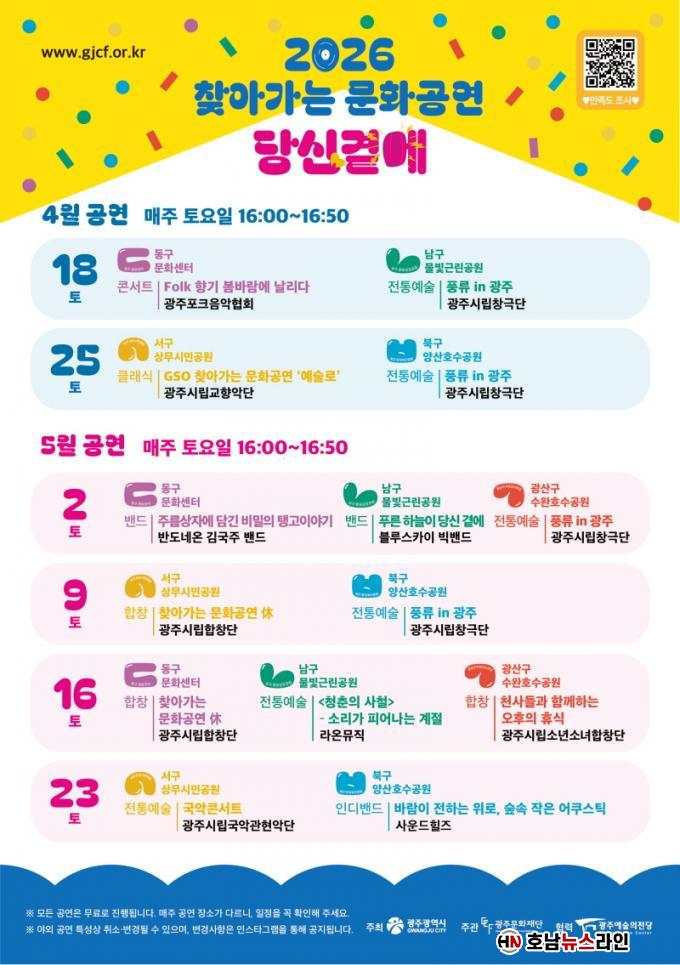 ¿ÃÇØ ù ¸·À» ¿Ã¸®´Â 4¿ù18ÀÏ °ø¿¬Àº µ¿±¸¿Í ³²±¸¿¡¼ °¢°¢ ÁøÇàµÈ´Ù. µ¿±¸¹®È¼¾ÅÍ¿¡¼´Â ±¤ÁÖÆ÷Å©À½¾ÇÇùȸÀÇ ¡®ÄܼƮ–Æ÷Å©(Folk), Çâ±â º½¹Ù¶÷¿¡ ³¯¸®´Ù¡¯ ¹êµå °ø¿¬ÀÌ, ³²±¸ ¹°ºû±Ù¸°°ø¿ø¿¡¼´Â ±¤Áֽø³Ã¢±Ø´ÜÀÇ ¡®Ç³·ù ÀÎ(in) ±¤ÁÖ¡¯ ÀüÅ뿹¼ú °ø¿¬ÀÌ ¹«´ë¿¡ ¿À¸¥´Ù.