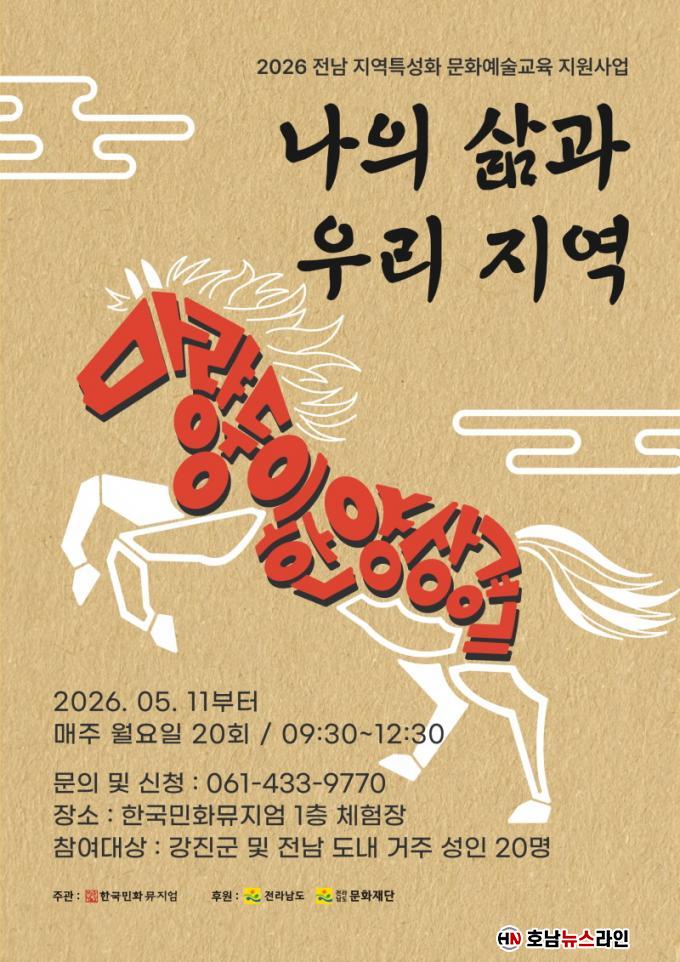 ±³À°Àº 5¿ù 11ÀϺÎÅÍ ¸ÅÁÖ ¿ù¿äÀÏ ¿ÀÀü 9½Ã 30ºÐºÎÅÍ 12½Ã 30ºÐ±îÁö ÃÑ 20ȸ¿¡ °ÉÃÄ Çѱ¹¹ÎȹÂÁö¾ö üÇèÀå¿¡¼ ÁøÇàµÈ´Ù. Âü°¡ÀÚµéÀº Àü¹®ÀûÀÎ ¹ÎÈ ½Ç±â ±³À°°ú ÇÔ²² ¿ì¸® Áö¿ªÀÇ ¿ª»çÀû ¹è°æÀÎ ¡®¸¶·®¡¯°ú ¡®ÇѾ硯À¸·Î À̾îÁö´Â »ó¡Àû Àǹ̸¦ Çö´ëÀûÀ¸·Î ÀçÇØ¼®ÇÏ¿© º»Àθ¸ÀÇ ÀÛǰÀ» ¿Ï¼ºÇÑ´Ù.