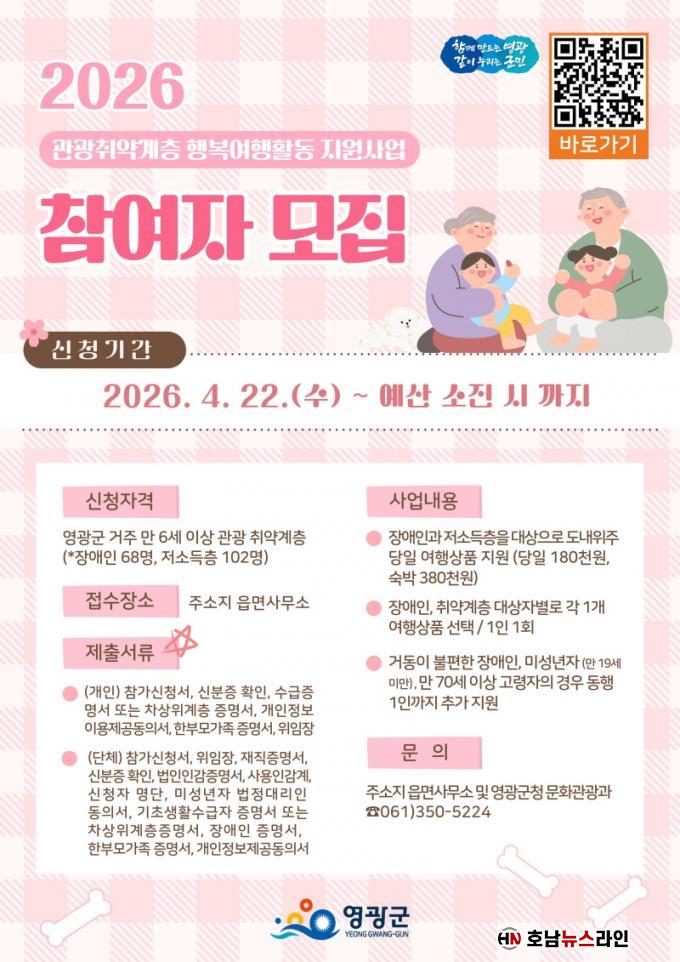 À̹ø »ç¾÷Àº ¿µ±¤±º¿¡ °ÅÁÖÇÏ´Â ¸¸ 6¼¼ ÀÌ»ó Àå¾ÖÀΰú Àú¼ÒµæÃþ ÁֹΠÃÑ 170¸íÀ» ´ë»óÀ¸·Î, 1ÀÎ ±âÁØ ´çÀÏ¿©Çà 18¸¸ ¿ø, 1¹Ú2ÀÏ ¿©Çà 38¸¸ ¿ø±îÁö Áö¿øÇϸç 4¿ù 22ÀϺÎÅÍ ¿¹»ê¾× 32,300õ ¿ø ¼ÒÁø ½Ã±îÁö ½ÅûÁ¢¼ö¸¦ ÇÏ°Ô µÈ´Ù.