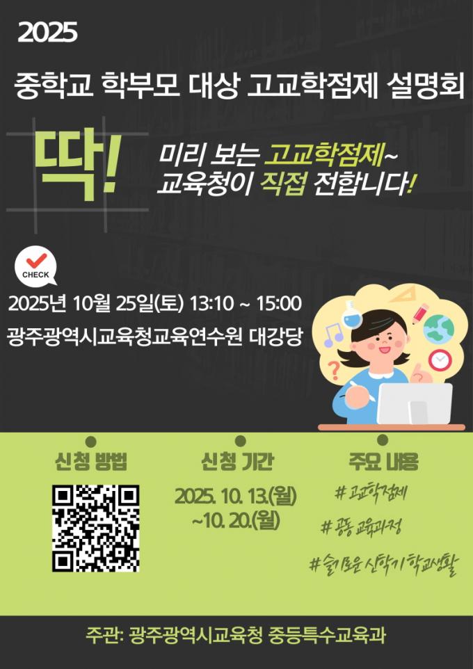 [È£³²´º½º¶óÀÎ = ¼ÀºÈ« ±âÀÚ] ±¤Áֽñ³À°Ã»(±³À°°¨ ÀÌÁ¤¼±)Àº ¿À´Â 25ÀÏ ¿ÀÈÄ 1½Ã ±¤Áֽñ³À°Ã»±³À°¿¬¼ö¿ø ´ë°´ç¿¡¼ ÁßÇб³ 3Çгâ Çлý Çкθ𸦠´ë»óÀ¸·Î ¡®°í±³ÇÐÁ¡Á¦ ¼³¸íȸ¡¯¸¦ °³ÃÖÇÑ´Ù. À̹ø ¼³¸íȸ´Â Áö³ 4¿ù Áß3, °í1 Çлý Çкθ𸦠´ë»óÀ¸·Î ÁøÇàÇÑ °í±³ÇÐÁ¡Á¦ ¼³¸íȸ ¡®±×·¡¼ °í±³ÇÐÁ¡Á¦°¡ ¹¹¿¹¿ä?¡¯¿¡ ÀÌ¾î ¸¶·ÃµÆ´Ù. ÁÖ¿ä ¼³¸í ³»¿ëÀº ¡ã°í±³ÇÐÁ¡Á¦ ¹× Çлý °ú¸ñ ¼±ÅÃ±Ç È®´ë¸¦ À§ÇÑ °øµ¿ ±³À°°úÁ¤ ¾È³» ¡ã2022 °³Á¤ ±³À°°úÁ¤ ¹× Æò°¡ ¹æ½Ä ¡ã°íµîÇб³ ½ÅÇб⠽½±â·Î¿î Çб³ µîÀÌ´Ù. ¶Ç º»Ã» ÁßµîÆ¯¼ö±³À°°ú ÀåÇС¦