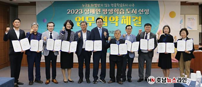 ³ªÁÖ½Ã(½ÃÀå À±º´ÅÂ)´Â 11ÀÏ ½Ãû»ç ÀÌȽǿ¡¼ Æò»ýÇнÀ ¿î¿µ±â°ü 10°÷ ´ëÇ¥ÀÚµé°ú ¡®Àå¾ÖÀÎ Æò»ýÇнÀµµ½Ã ¼º°øÀû ÃßÁøÀ» À§ÇÑ ¾÷¹« Çù¾à¡¯À» ü°áÇß´Ù°í ¹àÇû´Ù.