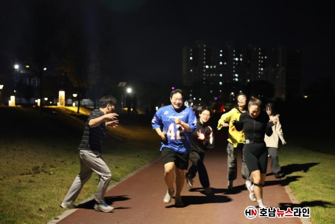 ¿ÀÈÄ 7½Ã, ½Å³ª´Â ÀüÀÚÀ½¾Ç(EDM)¿¡ ¸ÂÃç Áغñ ¿îµ¿À» ¸¶Ä£ 500¿© ¸íÀÇ Âü°¡ÀÚµéÀº ½ÅÈ£¿Í ÇÔ²² °¡Á·¡¤Ä£±¸ ´ÜÀ§·Î Á¶¸¦ ³ª´² Ãâ¹ßÇß´Ù. Ȳ·æÁ¤¿ø À½¾ÇºÐ¼ö µÚÆí¿¡¼ ½ÃÀÛÇØ Ȳ¹Ì¸£·£µå¸¦ ÇÑ ¹ÙÄû µ¹¾Æ ¡®Æ©ºê¡¯ Àå¾Ö¹°À» Åë°úÇϰí, ¿¬²ÉÁ¤¿øÀ» °ÅÃÄ ´Ù½Ã ½ÃÀÛÁ¡À¸·Î º¹±ÍÇÏ´Â 2.5km ÄÚ½º¿´´Ù.