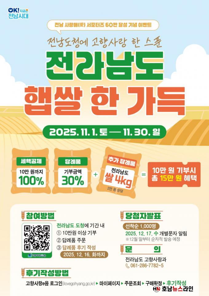 À̺¥Æ® Âü¿©´Â Àü³²µµÃ»¿¡ 10¸¸ ¿ø ÀÌ»ó ±âºÎÇÑ ÈÄ, °íÇâ»ç¶ûeÀ½¿¡¼ ´ä·ÊǰÀ» ÁÖ¹®¡¤¼ö·ÉÇÑ ´ÙÀ½ Èı⸦ ÀÛ¼ºÇϸé ÀÚµ¿À¸·Î ½ÅûµÈ´Ù. ÀÚ¼¼ÇÑ À̺¥Æ® °ü·Ã ³»¿ëÀº °íÇâ»ç¶ûeÀ½(ilovegohyang.go.kr) ´©¸®Áý¿¡¼ È®ÀÎÇÒ ¼ö ÀÖ´Ù.