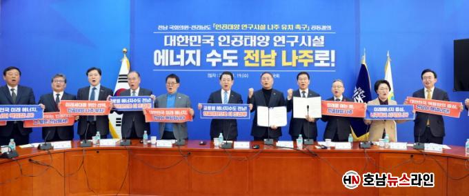 Àü³²µµ´Â À̳¯ ±è¿µ·Ï µµÁö»ç, ±è¿øÀÌ ¹ÎÁÖ´ç Àü³²µµ´çÀ§¿øÀå, ½ÅÁ¤ÈÆ ±¹È¸ ÇàÁ¤¾ÈÀüÀ§¿øÀå, ¹ÚÁö¿ø¡¤À̰³È£¡¤Á¶°è¿ø¡¤±è¹®¼ö¡¤±ÇÇ⿱ ±¹È¸ÀÇ¿ø°ú À±º´Å ³ªÁÖ½ÃÀå µîÀÌ Âü¼®ÇÑ °¡¿îµ¥ ±¹È¸ ¹ÎÁÖ´ç ¿ø³»´ëÇ¥ ȸÀǽǿ¡¼ ¡®ÀΰøÅÂ¾ç ¿¬±¸½Ã¼³ Àü³² ³ªÁÖ À¯Ä¡ Àü³² ±¹È¸ÀÇ¿ø °øµ¿°áÀǹ®¡¯À» ¹ßÇ¥Çß´Ù. ¿ÀÈÄ¿¡´Â ±¤ÁÖ¸¦ Áö¿ª±¸·Î µÐ ¾Èµµ°É¡¤ÀüÁø¼÷¡¤Á¤ÁØÈ£ ±¹È¸ÀÇ¿ø°ú ±¹È¸ ¼ÒÅë°ü¿¡¼ °øµ¿°áÀǹ®À» ¹ßÇ¥, ÀΰøÅÂ¾ç ¿¬±¸½Ã¼³ À¯Ä¡ ³ë·Â¿¡ ÈûÀ» ½Ç¾ú´Ù.