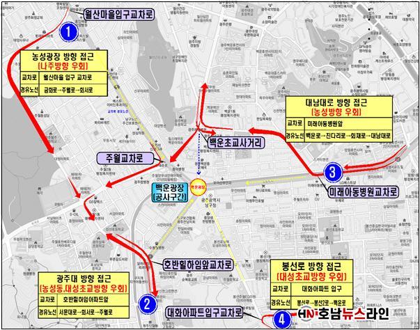 ÅëÁ¦ ±¸°£ Â÷·® ¿ìȸµµ·Î´Â ¡ã³ó¼º±³Â÷·Î¿¡¼ ¹é¿î±¤Àå ¹æÇâ ¡æ ¿ù»ê¸¶À» ÀÔ±¸ ±³Â÷·Î¿¡¼ ¾ç±ÃÀå ¹æÇ⠡㱤ÁÖ´ë¿¡¼ ¹é¿î±¤Àå ¡æ È£¹ÝÈúÇÏÀÓ ±³Â÷·Î¿¡¼ ¾ç±ÃÀå ¹æÇâ ¡ã³²±¤ÁÖ(ºÀ¼±¡¤¹æ¸²)¿¡¼ ¹é¿î±¤Àå ¡æ ¹Ì·¡¾Æµ¿º´¿ø ±³Â÷·Î¿¡¼ ±âµ¶º´¿ø(¼öÇǾƿ©°í) ¹æÇâ ¡ãºÀ¼±µ¿¿¡¼ ¹é¿î±¤Àå ¹æÇâ ¡æ ´ëÈ¾ÆÆÄÆ® ÀÔ±¸ ±³Â÷·Î¿¡¼ ºÀ¼±Áß¾Ó·Î(ºÀ¼±Ãʱ³) ¹æÇâ µîÀÌ´Ù.