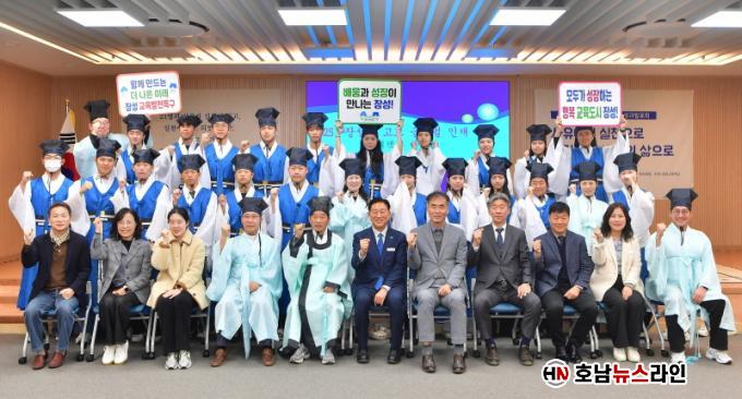 À̳¯ Á¹¾÷½Ä¿¡¼± ¡®°í±³ ±Û·Î¹ú ÀÎÀç Ä·ÇÁ¡¯ Âü¿© ÇлýµéÀÌ ±×°£ÀÇ È°µ¿ °á°ú¸¦ µ¹¾Æº¸°í, ¼º°ú¸¦ °øÀ¯Çß´Ù. Á¹¾÷Áõ¼ ¼ö¿©¿Í ÇÔ²² ÁøÇàµÈ ¡®¼¼Ã¥·Ê(á©óüÖÉ)¡¯ ½Ã°£¿¡´Â Á¹¾÷»ýµéÀÌ Çкθð¿Í ½º½Â¿¡°Ô Å«ÀýÀ» ¿Ã·Á ¹Ú¼ö¸¦ ¹Þ¾Ò´Ù. ¡®¼¼Ã¥·Ê¡¯´Â ÇÑ ±ÇÀÇ Ã¥À» ´Ù ¹è¿î µÚ ½º½Â°ú µ¿·áµé¿¡°Ô ¶± µîÀ» ´ëÁ¢ÇÏ´Â ÀüÅë ¿¹ÀýÀ» ¸»ÇÑ´Ù.
