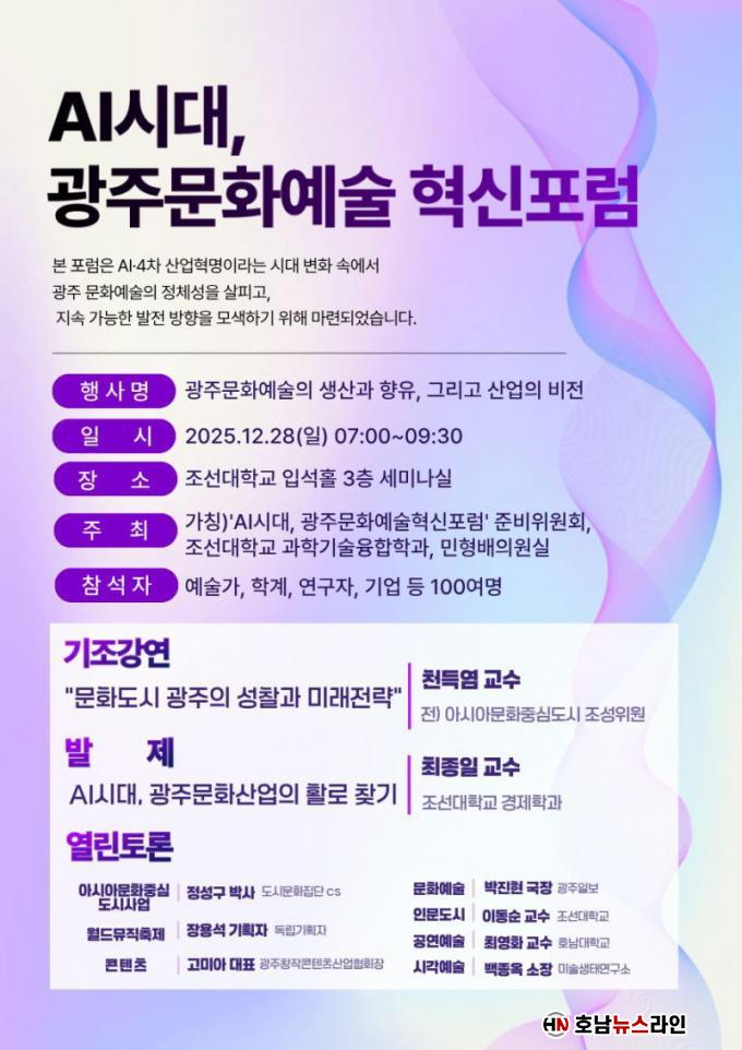 [È£³²´º½º¶óÀÎ = ¼­ÀºÈ« ±âÀÚ] ¹ÎÇü¹è ±¹È¸ÀÇ¿ø(´õºÒ¾î¹ÎÁÖ´ç, ±¤ÁÖ ±¤»êÀ»)Àº ¿À´Â 12¿ù 28ÀÏ(ÀÏ) ¿ÀÀü 7½Ã¿¡ Á¶¼±´ëÇб³ ÀÔ¼®È¦ 3Ãþ ¼¼¹Ì³ª½Ç¿¡¼­ ¡®AI½Ã´ë, ±¤ÁÖ¹®È­¿¹¼úÇõ½ÅÆ÷·³¡¯ ÁغñÀ§¿øÈ¸, Á¶¼±´ëÇб³ °úÇбâ¼úÀ¶ÇÕÇаú¿Í °øµ¿À¸·Î¡®AI½Ã´ë, ±¤ÁÖ¹®È­¿¹¼ú Çõ½Å Æ÷·³'À» °³ÃÖÇÑ´Ù.