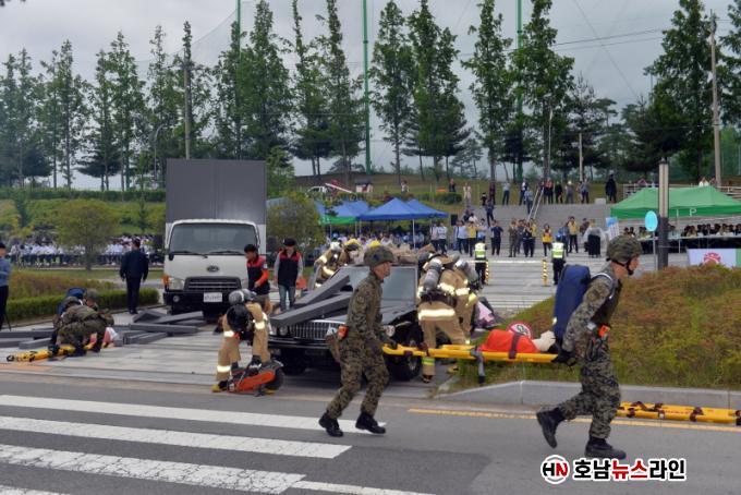 ³²±¸´Â Áö³ 10¿ù 20ÀÏ Ä¥¼®µ¿ °í½Î¿ò³îÀÌ Àü¼ö±³À°°ü¿¡¼ ±ººÎ´ë¿Í °æÂû, ¼Ò¹æ¼, º´¿ø, Çѱ¹Àü·Â µî °ü°è±â°ü 15°÷°ú ÇÔ²² ÁöÁø°ú ºØ±«, ÈÀç µîÀ» µ¿¹ÝÇÑ º¹ÇÕÀç³ ¹ß»ý ½Ã³ª¸®¿À¿¡ µû¸¥ ½ÇÀü°ú °°Àº ´ë±Ô¸ð ÇÕµ¿ÈÆ·ÃÀ» ½Ç½ÃÇØ ±ä±Þ ´ëÇÇ ¹× ºÎ»óÀÚ‧ÀÌÀç¹Î ±¸È£ Á¶Ä¡ µî Àç³ »óȲº° ´ëÀÀÀ» ¿Ïº®ÇÏ°Ô ¼±º¸¿© Æò°¡À§¿øµéÀÇ È£ÆòÀ» À̲ø¾ú´Ù.