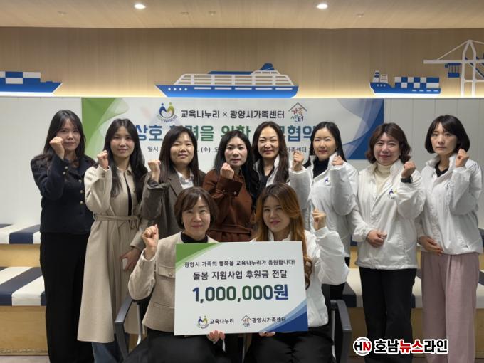 Çù¾à½Ä°ú ÇÔ²² ¿¸° ÈÄ¿ø±Ý Àü´Þ½Ä¿¡¼´Â ±³À°³ª´©¸®°¡ ±¤¾ç½Ã°¡Á·¼¾ÅÍ µ¹º½Áö¿øÆÀ¿¡ ÈÄ¿ø±Ý 100¸¸ ¿øÀ» ±âŹÇßÀ¸¸ç, ÇØ´ç ÈÄ¿ø±ÝÀº °¡Á· ´ë»ó µ¹º½Áö¿ø»ç¾÷ÀÎ ¡®°øµ¿À°¾Æ³ª´®ÅÍ¡¯ ÇÁ·Î±×·¥ ¿î¿µ¿¡ Ȱ¿ëµÉ ¿¹Á¤ÀÌ´Ù.