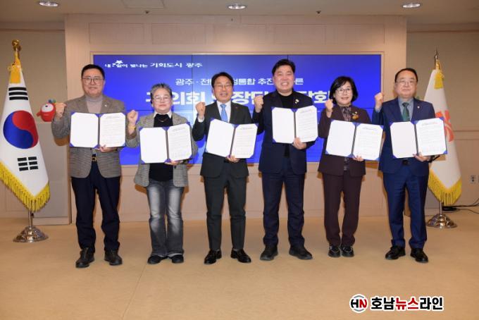 ±¤ÁÖ±¤¿ª½Ã(½ÃÀå °±âÁ¤)´Â 12ÀÏ ½Ãû ºñÁî´Ï½º·ë¿¡¼ ¡®±¤ÁÖ¡¤Àü³² ÇàÁ¤ÅëÇÕ¡¯ °ü·Ã ÀÚÄ¡±¸ÀÇȸ ÀÇÀå´Ü °£´ãȸ¸¦ ¿¾î ¡®(°¡Äª)±¤ÁÖÀü³²Æ¯º°½Ã¡¯ÀÇ ¼º°øÀûÀÎ ¾ÈÂøÀ» À§ÇØ »óÈ£ ±ä¹ÐÈ÷ Çù·ÂŰ·Î ÇÏ´Â ´ëÅëÇÕ °øµ¿ ¼±¾ð¹®À» äÅÃ, ¹ßÇ¥Çß´Ù.