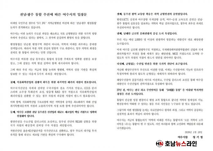 Á¤±â¸í ¿©¼ö½ÃÀåÀº ¡°¿©¼ö´Â °ú°Å Àü±¹ ÃÖÃÊ·Î ÁֹιßÀǸ¦ ÅëÇÑ ¡®3·Á ÅëÇÕ¡¯À» ÀÌ·ï³½ ÀÚÄ¡ ºÐ±ÇÀÇ »ó¡Àû µµ½Ã¡±¶ó¸ç ¡°À̹ø ÇàÁ¤ÅëÇÕÀÌ ¿©¼öÀÇ Á¤Ã¼¼ºÀ» ÁöŰ¸é¼µµ »õ·Î¿î µµ¾àÀÇ ±âȸ°¡ µÉ ¼ö ÀÖµµ·Ï ½Ã¹Îµé°ú ÇÔ²² Ä¡¹ÐÇÏ°Ô ´ëÀÀÇØ ³ª°¡°Ú´Ù¡±¶ó°í ¹àÇû´Ù.