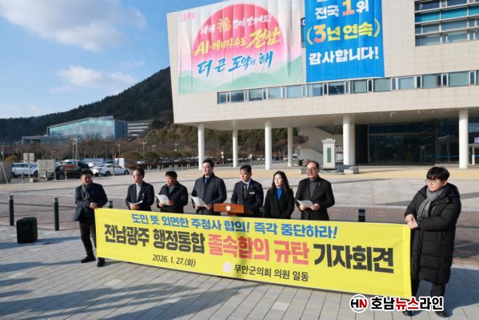 ±ºÀÇȸ´Â ¡°ÀÌ¹Ì 1¿ù 25ÀÏ °£´ãȸ¿¡¼ ÁÖû»ç¸¦ ¹«¾È Àü¶ó³²µµÃ»À¸·Î ÇÑ´Ù´Â ÀáÁ¤ ÇÕÀǰ¡ ÀÖ¾úÀ½¿¡µµ À̸¦ µÚÁý°í ¡®ÁÖû»ç´Â Ưº°½ÃÀå ±ÇÇÑ¡¯À̶ó°í µ¹·Á ¸»ÇÑ °ÍÀº ÅëÇÕÀÇ ´ë¿øÄ¢ÀÎ »ó»ý°ú ±ÕÇü¹ßÀüÀ» ½º½º·Î ºÎÁ¤ÇÑ °Í¡±À̶ó¸ç ¡°Àü³²µµÁö»ç ±è¿µ·ÏÀº µµ¹Î°ú ¹«¾È±º¹ÎÀÇ µÚÅë¼ö¸¦ Ä£ Ã¥ÀÓÀ» ÇÇÇÒ ¼ö ¾ø´Ù¡±°í ÁöÀûÇß´Ù.