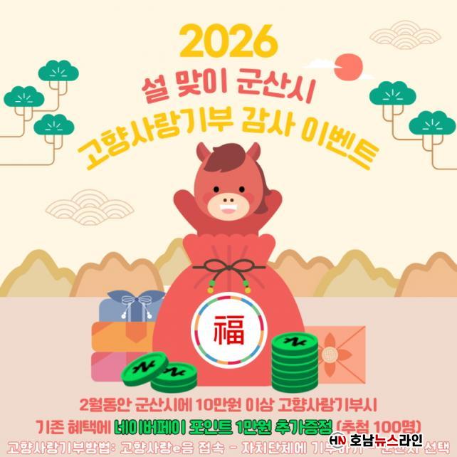 À̹ø Çà»ç´Â ¼³ ¿¬ÈÞ ±â°£À» Æ÷ÇÔÇØ 2¿ù 1ÀϺÎÅÍ 28ÀϱîÁö ÁøÇàµÇ¸ç, ±º»ê½Ã¿¡ 10¸¸ ¿ø ÀÌ»ó °íÇâ»ç¶û±âºÎ¿¡ Âü¿©Çϸé ÀÚµ¿À¸·Î ÀÀ¸ðµÈ´Ù. Âü¿©ÀÚ Áß ¹«ÀÛÀ§ Ãß÷À» ÅëÇØ ¼±Á¤µÈ 100¸í¿¡°Ô´Â 1¸¸ ¿ø »ó´çÀÇ ¡®³×À̹öÆäÀÌ Æ÷ÀÎÆ®¡¯ ¸ð¹ÙÀÏ ÄíÆùÀ» Ãß°¡·Î ÁõÁ¤Çϸç, ´ç÷ÀÚ´Â 3¿ù Áß °³º° ¹®ÀÚ¸¦ ÅëÇØ ¾È³»ÇÒ ¿¹Á¤ÀÌ´Ù.