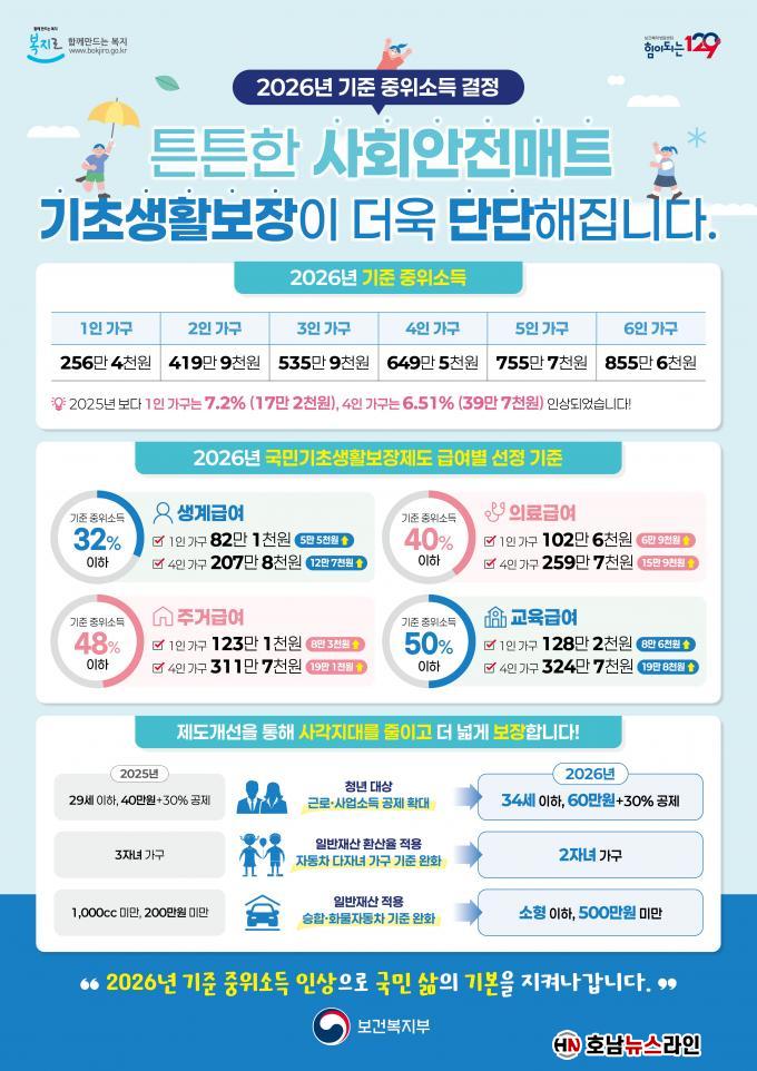 2026³â ±âÁØÁßÀ§¼Òµæ(±¹¹Î °¡±¸¼ÒµæÀÇ Áß°£°ªÀ¸·Î º¹Áö»ç¾÷À» ¼±Á¤ÇÏ´Â ±âÁØ)Àº 4ÀÎ °¡±¸ ±âÁØ 649¸¸ 4õ738¿øÀ¸·Î Áö³Çغ¸´Ù 6.51% ÀÎ»óµÆ´Ù. ¹°°¡ »ó½Â°ú »ý°èºñ ºÎ´ã Áõ°¡¸¦ ¹Ý¿µÇÑ ¿ª´ë ÃÖ°í ¼öÁØÀÇ Àλó·üÀÌ´Ù.