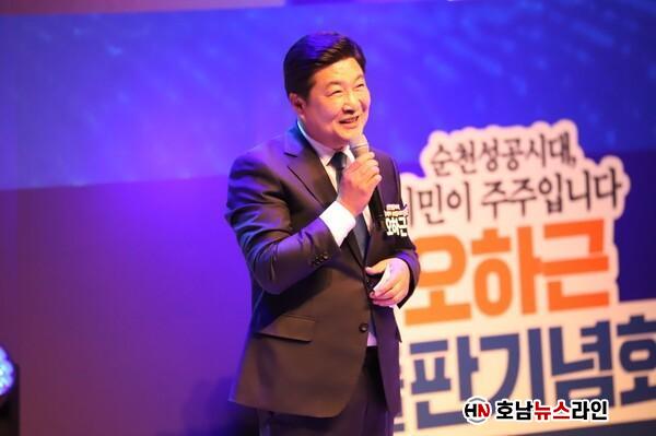 À̾î "±¤ÁÖÀü³² ÅëÇÕÀÇ ±âȸ¿Í °æÁ¦Àû ¼ºÀå ¶ÇÇÑ ½Ã¹ÎÀÇ ¸òÀ̾î¾ß ÇÑ´Ù"¸ç "¼øÃµÀº Áö±Ý Áß¿äÇÑ ´ëÀüȯÀÇ ±â·Î¿¡ ¼ ÀÖ´Ù. º¯ÈÀÇ ½Ã´ë¿¡ µµ½ÃÀÇ °æÀï·ÂÀº °á±¹ ºÎÀ¯ÇÑ ½Ã¹Î¿¡°Ô¼ ³ª¿Â´Ù"°í ¸»Çß´Ù. ¶ÇÇÑ "°æÁ¦ÀûÀ¸·Î dz¿ä·Ó°í, ¾ÈÀü°ú »ý¸íÀÌ ÁöÄÑÁö´Â ¼øÃµÀÌ ³ª¾Æ°¡¾ß ÇÒ ¹Ì·¡¿Í ºñÀü¿¡ ´ëÇÑ °í¹ÎÀ» Ã¥¿¡ ´ã¾Ò´Ù"°í ¸»Çß´Ù.