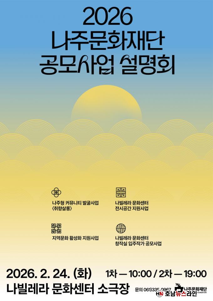 ³ªÁÖ¹®ÈÀç´ÜÀº ¿À´Â 2¿ù 24ÀÏ ³ªºô·¹¶ó¹®È¼¾ÅÍ ¼Ò±ØÀå¿¡¼ ¡®2026³â ³ªÁÖ¹®ÈÀç´Ü ÅëÇÕ °ø¸ð»ç¾÷¼³¸íȸ¡¯¸¦ ¿¬´Ù°í 13ÀÏ ¹àÇû´Ù. À̹ø ¼³¸íȸ´Â Áö¿ª¹Î°ú ¿¹¼úÀÎÀ» ´ë»óÀ¸·Î Àç´ÜÀÇ ¿¬Áß »ç¾÷À» Á¾ÇÕÀûÀ¸·Î ¾È³»ÇÏ°í °ø¸ð»ç¾÷ Âü¿©¸¦ µ¶·ÁÇϱâ À§ÇØ ¸¶·ÃÇß´Ù.