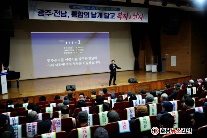 °±âÁ¤ ½ÃÀåÀº ¡°±¤ÁÖÀü³²ÀÇ ÅëÇÕÀº ´Ü¼øÈ÷ ÇàÁ¤±¸¿ªÀ» ÇÕÄ¡´Â Â÷¿øÀ» ³Ñ¾î ½Ã¹ÎÀÇ »îÀÇ ÁúÀ» ¹Ù²Ù´Â ¼±Åá±À̶ó¸ç ¡°ÅëÇÕÀ» ÅëÇØ ¼öµµ±Ç¿¡ ´ëÀÀÇÏ´Â Ãʱ¤¿ª »ê¾÷ Á߽ɵµ½Ã¸¦ ¸¸µé°í, ¡®ÀÎ(In)¼¿ï¡¯ÀÌ ¾Æ´Ñ ¡®ÀÎ(In)±¤ÁÖ, ÀÎ(In)Àü³²¡¯ÀÇ ½Ã´ë¸¦ ¿°Ú´Ù¡±°í °Á¶Çß´Ù.
