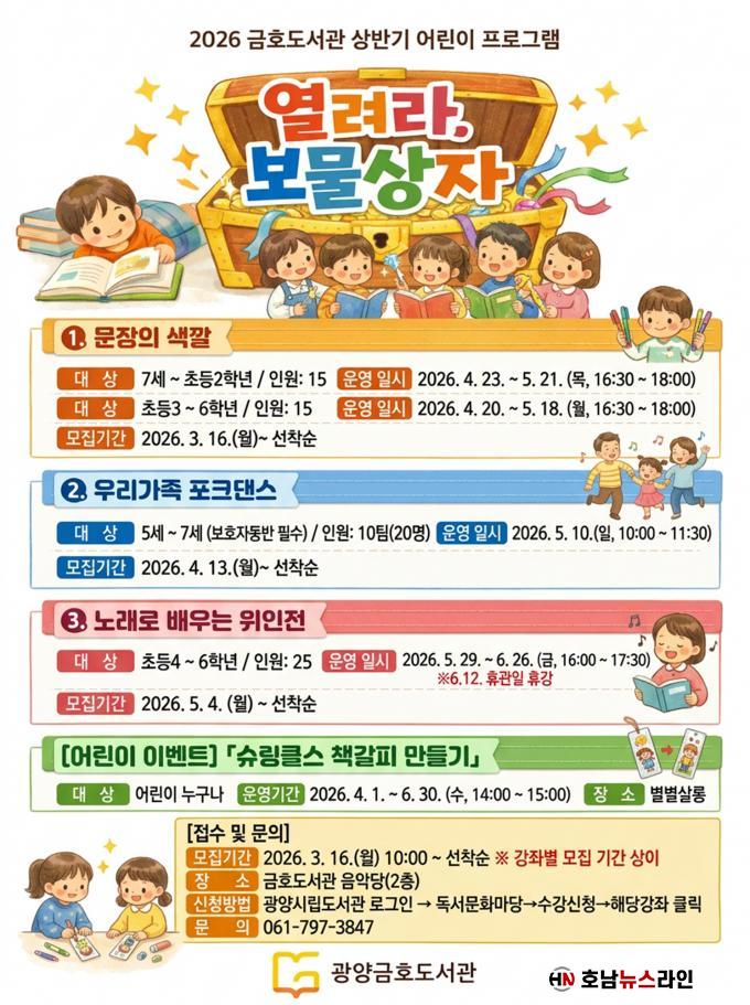 ÇÑÆí, 2026³â ±ÝÈ£µµ¼°ü »ó¹Ý±â ¾î¸°ÀÌ ÇÁ·Î±×·¥°ú °ü·ÃÇÑ ÀÚ¼¼ÇÑ »çÇ×Àº ±¤¾ç½Ã¸³µµ¼°ü ´©¸®Áý(http://lib.gwangyang.go.kr)¿¡¼ È®ÀÎÇϰųª ±ÝÈ£µµ¼°ü(¢Ï061-797-3847)À¸·Î ¹®ÀÇÇÏ¸é ¾È³»¹ÞÀ» ¼ö ÀÖ´Ù.
