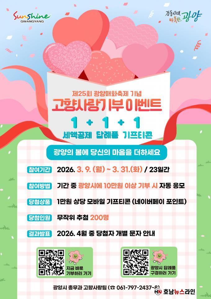 À̹ø À̺¥Æ®´Â '1+1+1' ÇýÅÃÀ» Áß½ÉÀ¸·Î ¸¶·ÃµÆ´Ù. °íÇâ»ç¶û±âºÎÁ¦¸¦ ÅëÇØ ±¤¾ç½Ã¿¡ 10¸¸ ¿øÀ» ±âºÎÇϸé Àü¾× ¼¼¾×°øÁ¦¸¦ ¹ÞÀ» ¼ö ÀÖÀ¸¸ç, ±âºÎ¾×ÀÇ 30% À̳»¿¡¼ °ù°¨, Àçø±¹, ±âÁ¤¶± µî ±¤¾ç½Ã Áö¿ª Ư»êǰÀ» ´ä·ÊǰÀ¸·Î ¹ÞÀ» ¼ö ÀÖ´Ù. ¿©±â¿¡ ¸ð¹ÙÀÏ ±âÇÁƼÄÜ ÇýÅñîÁö ´õÇØÁ® ±âºÎ Âü¿©ÀÇ ¸¸Á·µµ¸¦ ³ôÀÏ °ÍÀ¸·Î ±â´ëµÈ´Ù.