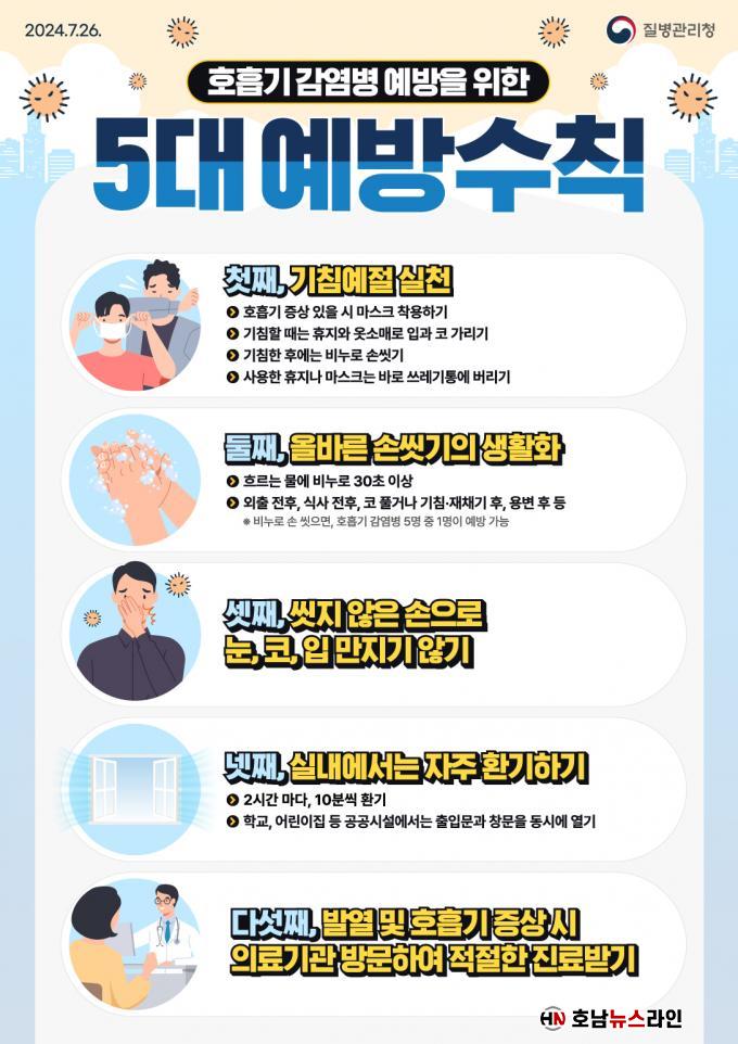 È£Èí±â °¨¿°º´ ¿¹¹æÀ» À§ÇÑ 5´ë ¼öÄ¢Àº ±âħ ¿¹Àý ½Çõ, ¿Ã¹Ù¸¥ ¼Õ ¾Ä±âÀÇ »ýȰÈ, ¾ÄÁö ¾ÊÀº ¼ÕÀ¸·Î ´«, ÄÚ, ÀÔ ¸¸ÁöÁö ¾Ê±â, ½Ç³»¿¡¼´Â ÀÚÁÖ È¯±âÇϱâ, ¹ß¿ ¹× È£Èí±â Áõ»ó ½Ã ÀÇ·á±â°ü ¹æ¹®ÇÏ¿© ÀûÀýÇÑ Áø·á ¹Þ±âÀÌ´Ù.
