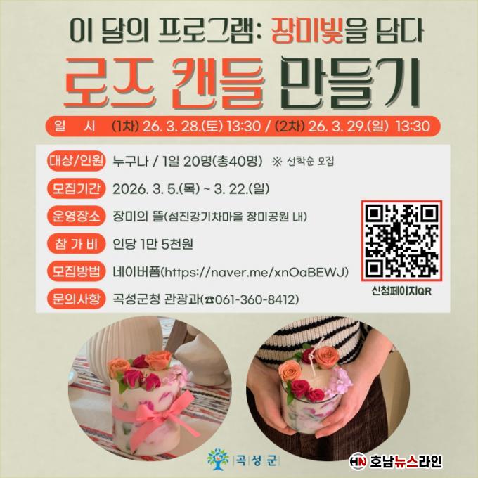 À̹ø ÇÁ·Î±×·¥Àº °î¼º ¼¶Áø°±âÂ÷¸¶À» Àå¹Ì°ø¿ø ³» ¡®Àå¹ÌÀÇ ¶ã¡¯¿¡¼ ÁøÇàµÇ´Â üÇèÇü °ü±¤ Çà»ç·Î, º½À» ¸Â¾Æ Àå¹ÌÀÇ Çâ±â¿Í °¨¼ºÀ» Á÷Á¢ ´ã¾Æº¼ ¼ö ÀÖµµ·Ï ¸¶·ÃµÆ´Ù. ¿î¿µ ½Ã°£Àº ¿ÀÈÄ 1½Ã 30ºÐºÎÅÍÀ̸ç ÇÏ·ç 20¸í¾¿ ÃÑ 40¸íÀ» ¸ðÁýÇÑ´Ù.
