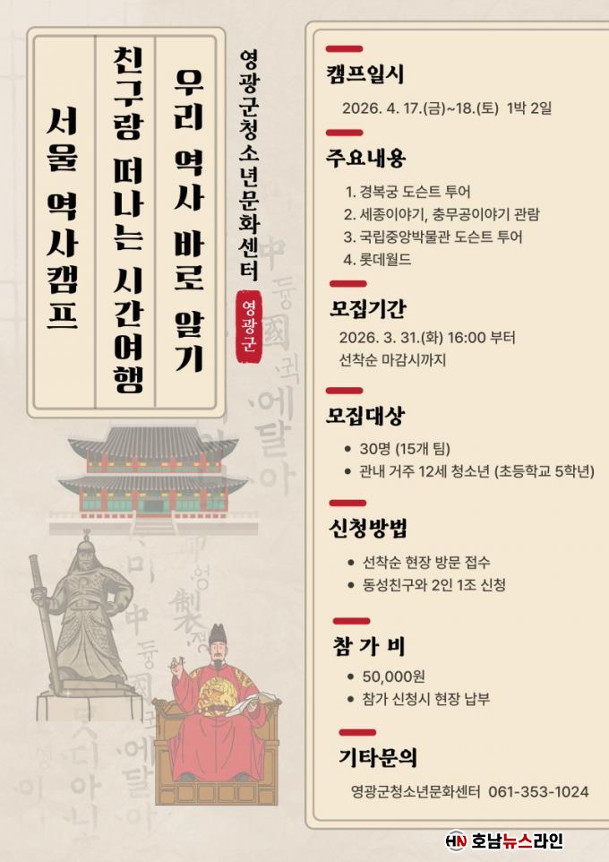 À̹ø Ä·ÇÁ´Â ¿À´Â 4¿ù 17ÀϺÎÅÍ 18ÀϱîÁö 1¹Ú 2Àϰ£ ÁøÇàµÇ¸ç, ¿µ±¤±º °ü³» ÃʵîÇб³ 5Çгâ û¼Ò³â 30¸íÀ» ´ë»óÀ¸·Î ¼¿ïÀÇ ÁÖ¿ä ¿ª»ç¡¤¹®È ¸í¼Ò¸¦ ޹æÇÑ´Ù.