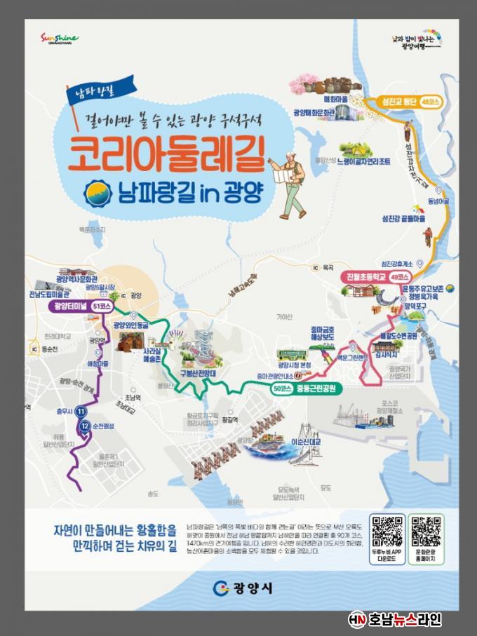 ÇÑÆí, ÄÚ¸®¾ÆµÑ·¹±æÀº µ¿Çؾȡ¤¼Çؾȡ¤³²Çؾȡ¤DMZ ÆòÈÀÇ ±æÀ» ¿¬°áÇÑ ¾à 4,500km ±Ô¸ðÀÇ µµº¸ ¿©Çà±æÀÌ´Ù. ÀÌ °¡¿îµ¥ ³²ÆÄ¶û±æÀº ºÎ»ê¿¡¼ ÇØ³²±îÁö ³²ÇؾÈÀ» µû¶ó À̾îÁö´Â ±¸°£À¸·Î, ÇØ¾È°ú µµ½Ã dz°æÀ» ÇÔ²² Áñ±æ ¼ö ÀÖ´Â °È±â ±æÀÌ´Ù. ƯÈ÷ ±¤¾ç ±¸°£Àº ¼¶Áø°°ú ±¤¾ç¸¸, µµ½É°ú »ê, ¹®È¿¹¼ú ÀÚ¿øÀÌ ¿¬°áµÅ ÀÖ¾î »ç°èÀý ´Ù¾çÇÑ Å׸¶¸¦ Áñ±æ ¼ö ÀÖ´Â °ÍÀÌ Æ¯Â¡ÀÌ´Ù.