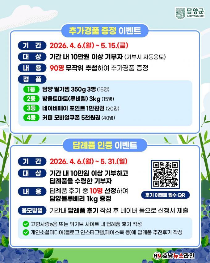 ÀÎÁõ À̺¥Æ®´Â 4¿ù 6ÀϺÎÅÍ 5¿ù 31ÀϱîÁö ´ã¾ç±º¿¡ 10¸¸ ¿ø ÀÌ»ó ±âºÎÇÏ°í ´ä·ÊǰÀ» ¹ÞÀº ±âºÎÀÚ¸¦ ´ë»óÀ¸·Î Çϸç, Á¤¼º½º·¯¿î Èı⸦ ÀÛ¼ºÇÑ ±âºÎÀÚ Áß 10¸íÀ» ¼±Á¤ÇÏ¿© ´ã¾ç ºí·çº£¸® 1kgÀ» ÁõÁ¤ÇÑ´Ù.