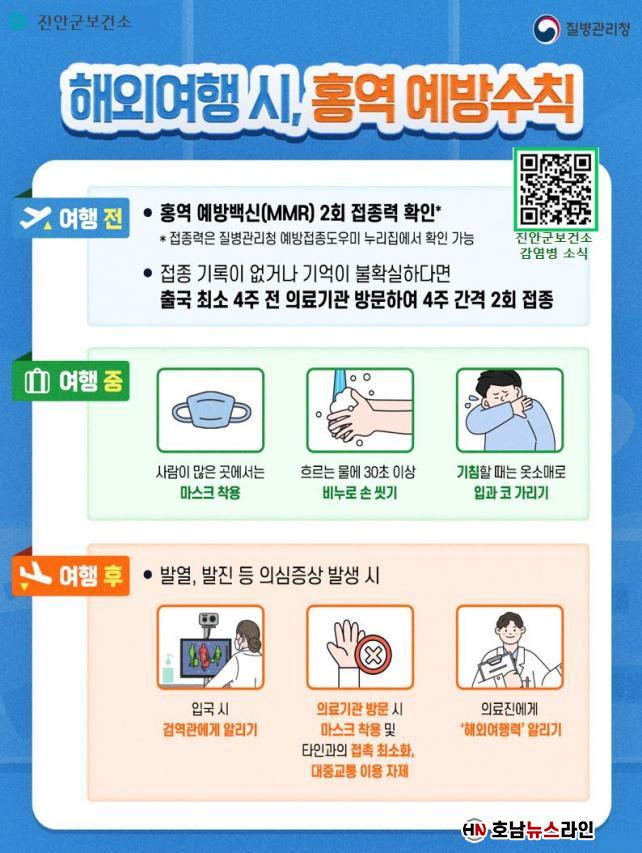 ¶ÇÇÑ ÇØ¿Ü ü·ù Áß¿¡´Â »ç¶÷ÀÌ ¸¹ÀÌ ¸ðÀÌ´Â Àå¼Ò¿¡¼ ¸¶½ºÅ© Âø¿ë, ¼Õ ¾Ä±â, ±âħ¿¹Àý Áؼö µî °³ÀÎÀ§»ý ¼öÄ¢À» öÀúÈ÷ ÁöÄÑ¾ß Çϸç, ±Í±¹ ÈÄ 3ÁÖ À̳» ¹ß¿À̳ª ¹ßÁø Áõ»óÀÌ ³ªÅ¸³¯ °æ¿ì Áï½Ã ÀÇ·á±â°üÀ» ¹æ¹®Çϰí ÇØ¿Ü¿©Çà·ÂÀ» ¹Ýµå½Ã ¾Ë·Á¾ß ÇÑ´Ù.