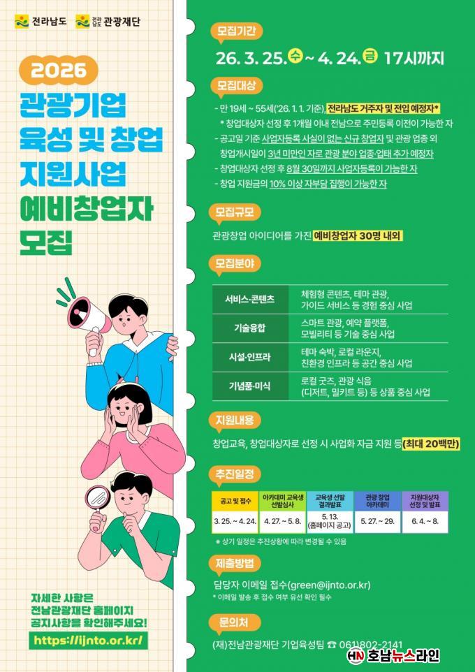 4¿ù 24ÀÏ ¿ÀÈÄ 5½Ã±îÁö À̸ÞÀÏ·Î Á¢¼öÇϸç, ÀÚ¼¼ÇÑ »çÇ×Àº Àü³²µµ(jeonnam.go.kr)¿Í Àü³²°ü±¤Àç´Ü(ijnto.or.kr) ´©¸®Áý¿¡¼ È®ÀÎÇÒ ¼ö ÀÖ´Ù.